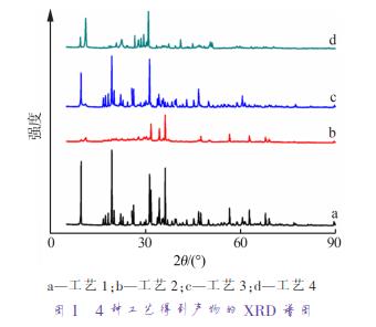 a—工藝 1;b—工藝 2;c—工藝 3;d—工藝 4 圖 1 4 種工藝得到產物的 XRD 譜圖a—工藝 1;b—工藝 2;c—工藝 3;d—工藝 4 圖 2 4 種工藝得到產物的 SEM 照片