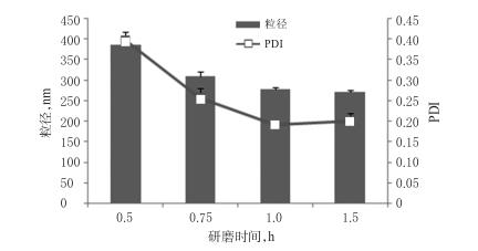 2.1.3研磨時(shí)間的篩選稱取BRE原料藥7.5g,置于含有吐溫80(1.125g)的水溶液(22.5mL)中,攪拌混懸,加入氧化鋯珠(粒徑為0.6mm)450g,分別研磨0.5、0.75、1.0、1.5h,制備3批BRE納米晶混懸液。以BRE納米晶混懸液的粒徑、PDI為指標(biāo),篩選研磨時(shí)間。結(jié)果,隨著研磨時(shí)間的延長(zhǎng),BRE納米晶混懸液的粒徑、PDI逐漸減?。谎心?.5、0.75、1.0h時(shí),BRE納米晶混懸液的粒徑、PDI減小的幅度較大;研磨1.5h時(shí),BRE納米晶混懸液粒徑雖然較研磨1.0h時(shí)的粒徑減小,但減小幅度不大。綜合考慮能耗和時(shí)間,確定研磨時(shí)間為1h。研磨時(shí)間的篩選結(jié)果見圖3。